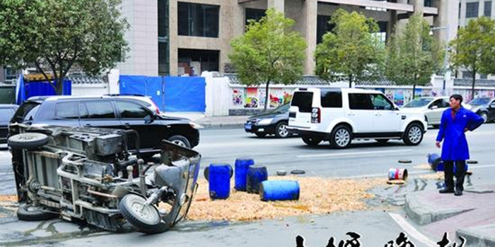 十堰三轮摩托车侧翻 所载泔水洒一地(图)