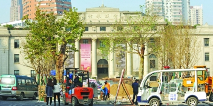 昨天上午,记者在武汉美术馆前的广场上,看到数十名工人正紧张地铺装大理石地砖,整个广场轮廓已基本成形,两排新移植的银杏树呈“V”形向中山大道聚焦,中间是正在施工的休闲草坪区。不过广场上两株苍老的梧桐却不规则地立在银杏树排列线外,打破了广场整体的对称布局。