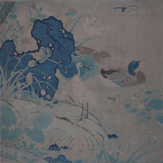 此件文物为南宋朱克柔的顶级传世之作。朱克柔,字强,一字刚,生于华亭县(今上海松江),自幼学习绘画与缂丝,积累配色和织作经验,其作品题材广泛,风格清淡古雅,为一时之绝技。此图中红叶白鹭,绿萍翠鸟,蜻蜓草虫,双鸭游乐,画面生动活泼,色彩富有变化。青石处有缂织隶书小款“江东朱刚制 莲塘乳鸭图”,下有“克柔”印一方。此件缂丝画幅式很大,组织紧密又富于变化,丝缕匀称适宜,层次分明,是现存宋代缂丝画作中的杰出作品。