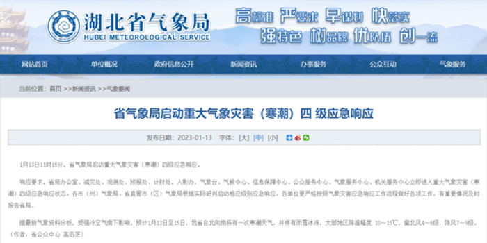 根据《湖北省气象灾害应急预案》相关规定,湖北省气象灾害应急指挥部决定自1月13日15时启动气象灾害(寒潮)四级应急响应。
