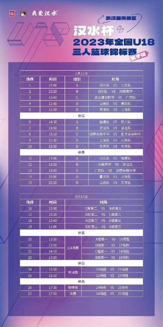 根据赛程安排,6月13日全天将进行15场小组赛的较量,6月14日则迎来淘汰赛阶段的比赛,压轴上演的决赛将于第二个比赛日的17:50打响,哪支队伍能够杀出重围获得冠军值得期待!