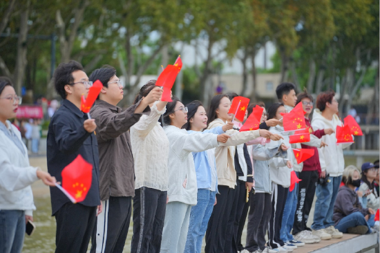一张张朝气蓬勃的脸庞,与手中挥舞的五星红旗相映生辉,融汇成一片红色的海洋。“这么多人一起唱国歌,情不自禁就跟着唱了起来,还有人给我们发了小红旗和脸贴,一下子就融入进去了。”人群中,市民刘大爷边用手机拍照边说,“在这样一个特殊的节日,作为一名中国人,我感到非常自豪!”