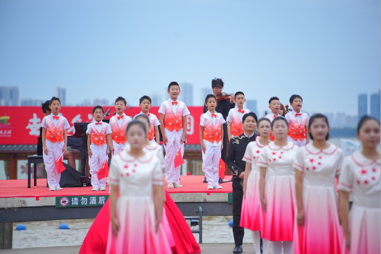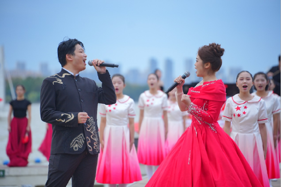 歌会现场安排了编钟、钢琴、电音乐队、小提琴、大提琴等乐器演奏以及美音合唱环节。当熟悉又动听的旋律响起,《歌唱祖国》、《今天是你的生日我的中国》、《我爱你中国》等一首首经典歌曲轮番开唱,激情澎湃的歌声萦绕在东湖上空,歌声起落间,满腔爱国情在无数的华夏儿女心间翻涌,家国同庆的壮丽画卷在大美东湖徐徐展开。