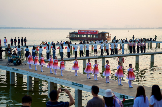当第一缕晨曦洒在东湖的湖面,凌波门栈桥上,人头攒动,五星红旗在国歌声中冉冉升起。“十一”当天,来自武汉大学、湖北大学、中国地质大学等的大学生们迎着日出放声高歌,为祖国庆生。同时,2000年悉尼奥运会竞走冠军王丽萍和射箭世界冠军苏文风惊喜现身,点燃了现场上万名游客的热情,全国各地的游客陆续自发加入到合唱队伍中,献礼国庆。