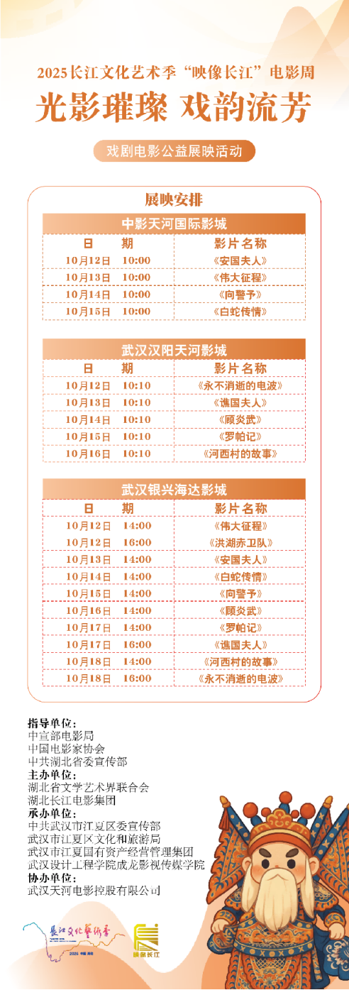 戏剧电影公益展映也将于12日同步启动,《伟大征程》《安国夫人》《顾炎武》《永不消逝的电波》《谯国夫人》《白蛇传·情》《向警予》《河西村的故事》《罗帕记》《洪湖赤卫队》(修复版)等多部优秀戏剧电影将在中影天河国际影城、武汉汉阳天河影城、武汉银兴海达影城与观众见面,广大影迷可直接到展映影城领票免费观影。