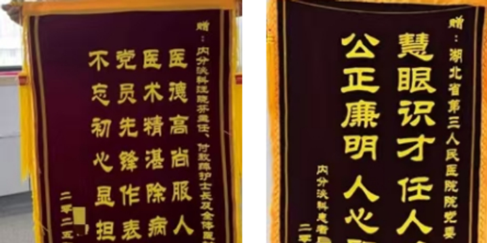 为了表达感激之情,李先生特意制作了两面锦旗表示感谢。赠予内分泌科的锦旗上写着:“医德高尚服人心、医术精湛除病痛、党员先锋作表率、不忘初心显担当”。而送至医院纪委的锦旗则写着:“慧眼识才、任人唯贤、公正廉明、人心所向”。