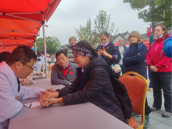 来自河南平顶山的游客黎明,在游玩返程途中被活动吸引,立即赶到现场进行咨询。国药东风总医院专家汪锡锡现场为他进行传统把脉问诊,开展中医体质辨别,并制定健康处方与调养方案。