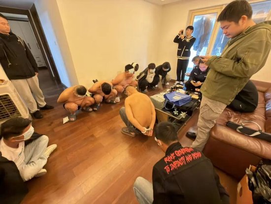 屋内,其余人员有的还在睡梦中,蜷缩在上下铺的被窝里;有的趴在桌上,手机屏幕还亮着群聊界面,上面全是“今天目标8个”“话术再背熟点”的字眼。突如其来的警察让他们有些惊慌失措,不到1分钟,屋内嫌疑人全部被双手上铐,控制起来,他们的脸上还残留着睡意与惊恐。