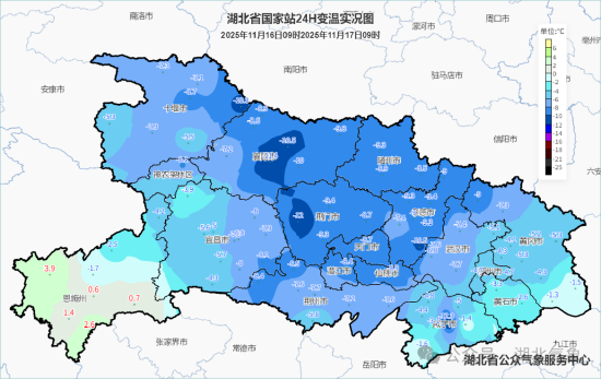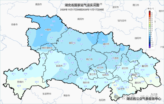 今天上午9时,除恩施和湖北东部部分县市外,省内大部地区气温已不足10℃,十堰、襄阳、随州等部分北部县市已不足5℃。湖北省北部和中部,较昨天气温普遍下降了7~10℃,并且今天白天气温还将持续下降。