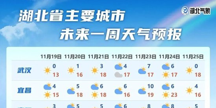 11月19日08时-20日08时,全省晴天到多云。最高气温12~16℃,最低气温-2~4℃,偏北风转偏南风2到3级。