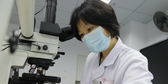 陈柳青主任看病理切片中 通讯员代雨朦 摄