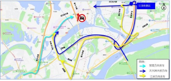 2、可提前由府河大桥、岱家山大桥、黄武公路、沪武高速等道路绕行,共三个绕行方向,具体如图所示: