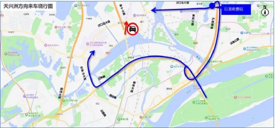 三环线天兴洲大桥→下匝道至沪武高速→巨龙收费站下高速→汉口北大道;