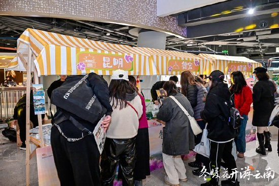 夜幕降临,“冬暖花开游云南”商圈路演与文旅集市精彩启幕,将活动热度推向新高。现场设置的多个展位集中展示云南特色手工艺品、地道土特产及非遗项目,参展商热情分享产品背后的文化故事,吸引众多武汉市民驻足观赏、选购心仪纪念品。同时,文旅集市还推出生拌牛皮、石斛鲜花饼、临沧坚果、雪花酥等滇味美食,鲜香独特的口感赢得武汉市民的一致好评,让大家在味蕾间提前“邂逅”云南。