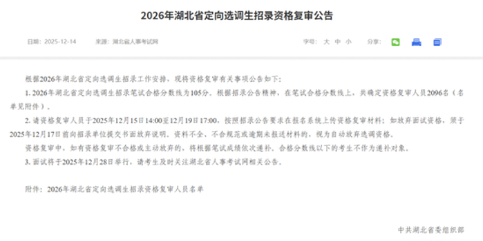 关注近日,湖北省委组织部发布《2026年湖北省定向选调生招录资格复审公告》。