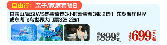 适合一家三口的套餐A,补贴后600元就能拿下甘露山/武汉WS热雪奇迹3小时滑雪票3张(2选1),还有武汉景区大门票3张(10选1)。