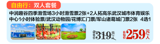 花259元就能get中润趣谷四季滑雪场3小时滑雪票2张,再加上拓高乐体验票/武汉动物园/花博汇/军山诸葛城门票2张(4选1)。