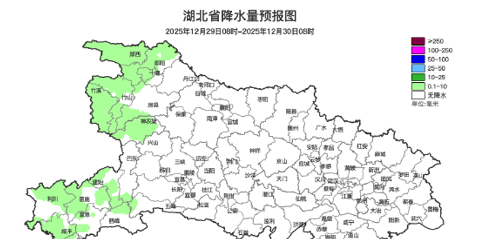 12月30日08时-31日08时,鄂西北、鄂西南、江汉平原西部多云到阴天,晚上转小到中雨,西部半高山以上地区有雨夹雪或雪、高山地区小到中雪、局地大雪;其他地区晴天到多云。最高气温中西部11~14℃、东部15~18℃,最低气温2~7℃,偏北风3到4级、阵风5到7级。