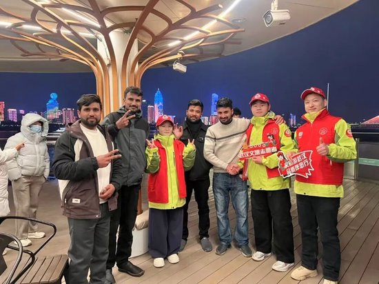 ·元旦假期,武汉文旅志愿者们来到武昌红巷旅游码头和两江游览开展志愿服务活动,巴基斯坦游客主动邀请志愿者一起合影