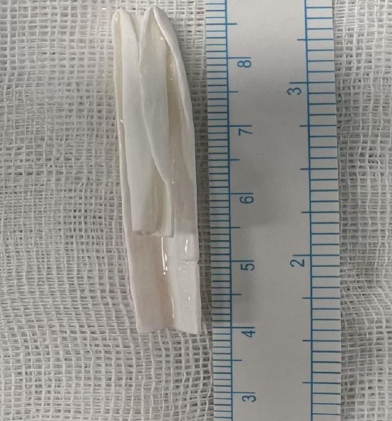 经过专业研判,医护选用了合适尺寸的异物钳,在高清电子支气管镜引导下,缓缓探入患儿左主支气管,巧妙钳住吸管一端,顺势将其整体拖出气道。只见这根吸管已经被小森咬得反折了,足足有5.5厘米的长度。吸管取出后,医护们发现小森的支气管内有大量脓性分泌物,已经有肺部感染的症状,随即为他进行了肺部盥洗。术后经抗感染、雾化等治疗,小森的咳嗽以及喉部不适感迅速缓解。