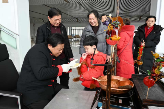 一旁的非遗展示区同样热闹。剪纸艺人巧手翻飞,一幅幅精巧的窗花顷刻成形;糖塑艺人捏制出栩栩如生的小动物,吸引不少小朋友围观。市民间文艺家协会的老师们一边制作一边讲解,让旅客在互动中感受传统文化的魅力。