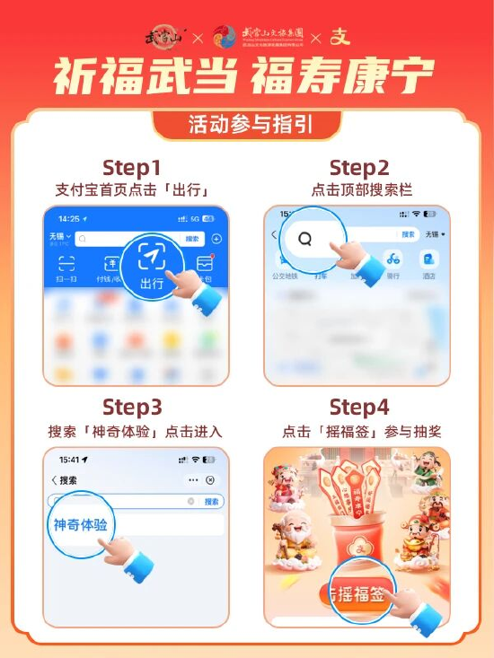 为提升游客体验,武当山联合支付宝推出“神奇体验”福利活动,活动时间为2月4日至3月30日。游客打开支付宝进入出行频道,搜索“神奇体验”即可参与抽奖,每日可抽且首次进入加赠1次机会。福利涵盖1000张武当山景区门票、500张《武当一梦》演出票及百万张出行优惠券,以真金白银的惠民举措,助力游客便捷出行、安心游玩。