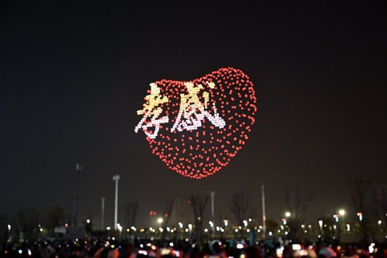 7时20分许,6000架无人机腾空而起,以星河为幕、光影作笔,开启首轮表演。无人机编队依次变幻出万马奔腾、我爱孝感、麻糖米酒、诗仙李白、云梦博物馆、快舟火箭、孝感文化中心等画面,每一帧都引发人群欢呼。8时20分许,文艺汇演结束后,无人机再次升空,孝感东站、城市新景、董永和七仙女、中原突围80周年、省十七运会会徽和吉祥物、马到成功等画面相继呈现,将活动推向高潮。