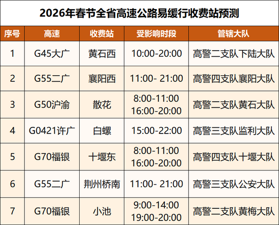 G107国道随州段,G240国道随州段,G316国道随州、孝感、武汉段,G318国道宜昌、荆州段,G346国道黄冈段,G347国道孝感段,G351国道荆州段,S254省道荆州段,S108省道孝感段等国省干道拥堵风险高。