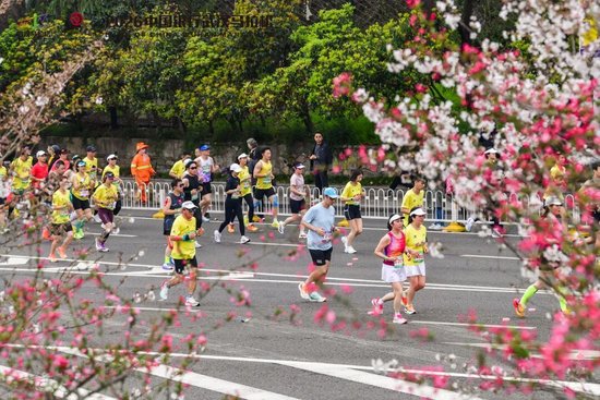 今年青山区首次被纳入汉马版图,在这条“最美冲刺赛道”的两侧,60余株新植的樱花树亭亭玉立,地面上78组樱花彩绘,让奔跑仿佛穿行于流动的花海。