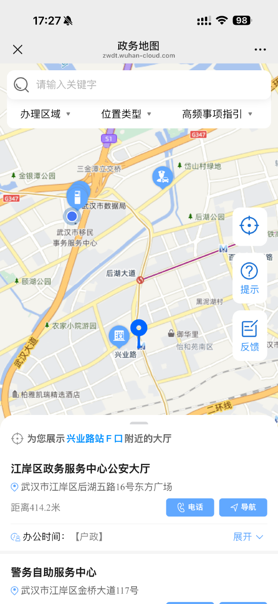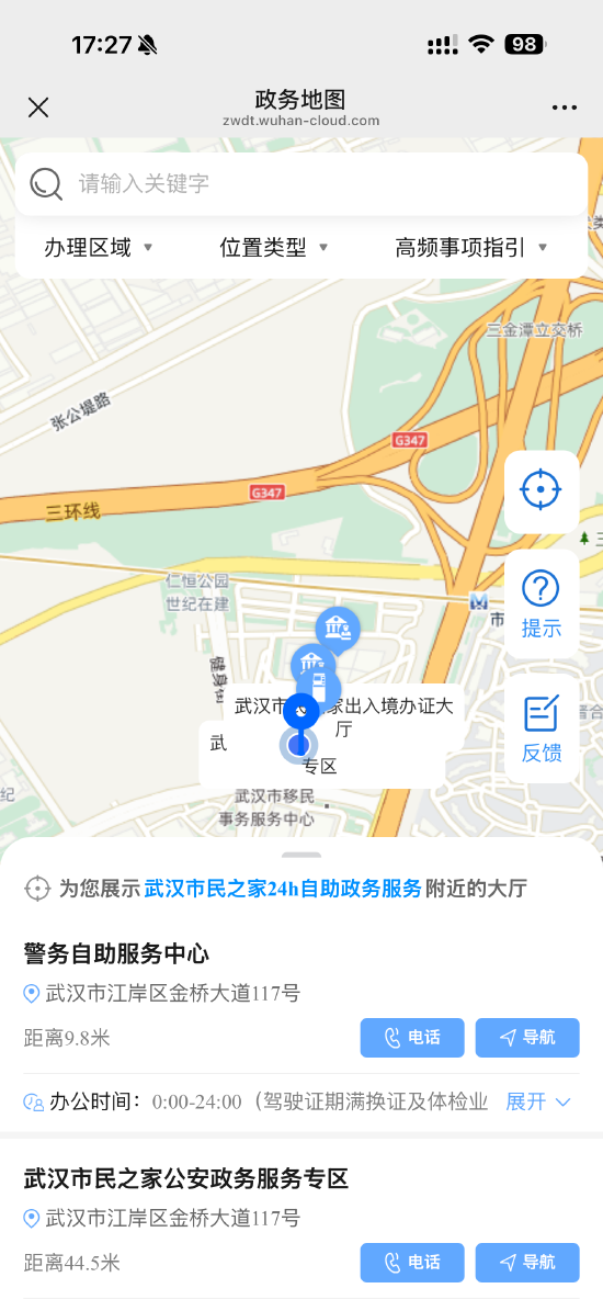 提示:遇节假日可点击地图“提示”按钮,获取武汉公安最新服务提示,避免空跑。