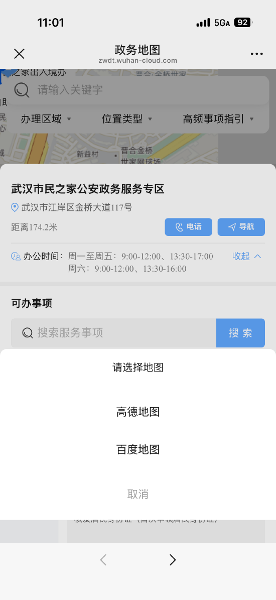 点击“导航”按钮,即可选择前往高德或百度地图自动规划路线,跟随导航准确抵达办事点。